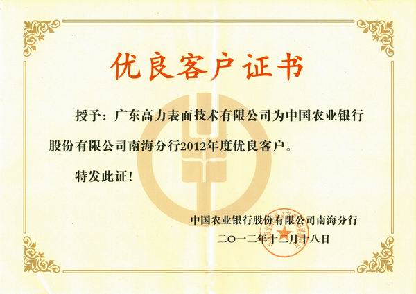 凭借雄厚的企业实力和良好的企业信誉,始终坚守着守诚信、讲信用的承诺,我集团多年来与多家银行保持良好的银企互动,与各银行建立了长期良好的合作伙伴关系。2012年,我集团保持良好信贷记录,获得各大银行一致好评:获中国农业银行南海分行授予“2012年度优良客户”证书,获浦发银行佛山支行授予“2012年度VIP客户”证书;获华夏银行授予“2012年度优质客户”证书等。