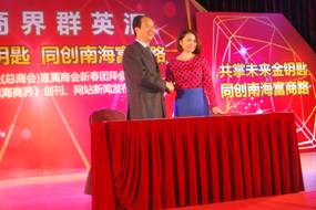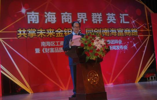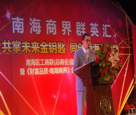 2013年3月16日下午,佛山市南海区工商联(总商会)直属商会在南海南国桃园枫丹白鹭酒店举行了《共掌未来金钥匙、同创南海富商路》大型春茗晚宴暨南海商界杂志创刊、网站新闻发布会。晚宴上,共邀请了来自社会各界共计五百多位嘉宾,其中邀请了美国、比利时等约十个国家副总领事与领事、前世界奥运冠军、本地政府领导、相关职能部门负责人与直属商会近200位会员单位负责人欢聚一堂、共叙友情。会上,直属商会会长梁权辉先生回顾了商会2012年的工作,同时展望了任重道远的2013年,并呼吁直属商会会员携手并进,锐意进取,积极配合区委区政府提出的“北斗星强民企” 计划,实现转型升级,力争将直属商会建成行业典范并涌现出一批真正做大做强的龙头企业,同时也希望商会秘书处将穿针引线的功能发挥到极致,将资源整合的平台扩展至无限。
