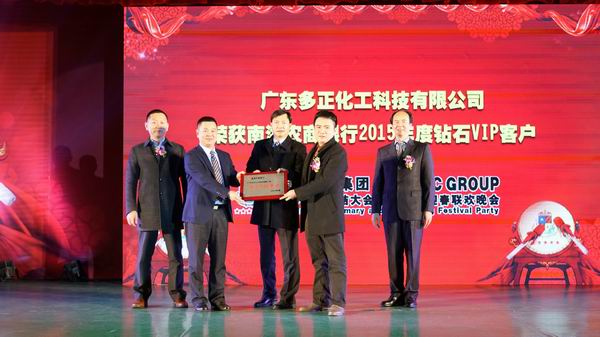 为答谢我集团在上一年度的大力配合与精诚合作,藉受邀出席本次晚会的机会,南海农商银行盐步支行行长黄挺先生、南海农商银行盐步支行副行长郭铭新先生特代表南海农商银行向广东高力集团旗下的三家精英企业颁发荣誉牌匾:授予广东多正化工科技有限公司“2015年度南海农商银行钻石VIP客户”荣誉称号,授予佛山市南海中南铝车轮制造有限公司、广东致卓精密金属科技有限公司“2015年度南海农商银行黄金VIP客户”荣誉称号。