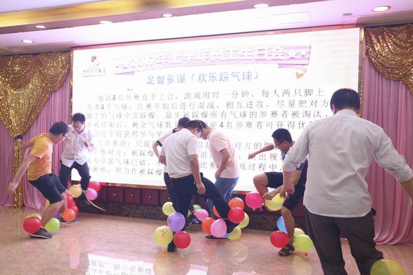 随后,佳肴上桌,大家食指大动开始品尝美味佳肴。在品尝的同时,主持人也不忘让大家继续参与到精彩纷呈的游戏中,第二、第三轮游戏:足智多谋(欢乐踩气球)以及好运连连(筷子夹兵乓球接力赛),游戏出场,场下同事们纷纷放下手中碗筷,积极参与其中,随着游戏的推进,胜负出炉,最终胜利者赢得了公司准备的丰富礼品。
