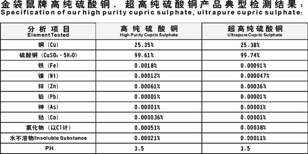 金袋鼠牌高纯硫酸铜、超高纯硫酸铜产品应用目前国内外最先进、最理想的高纯度硫酸铜生产技术生产,硫酸铜纯度高达99.5%,适合对硫酸铜要求严格的电镀行业(特别是电子线路板电镀)使用。据检测,产品质量媲美日本、俄罗斯等国进口的产品,完全可以代替进口产品使用。